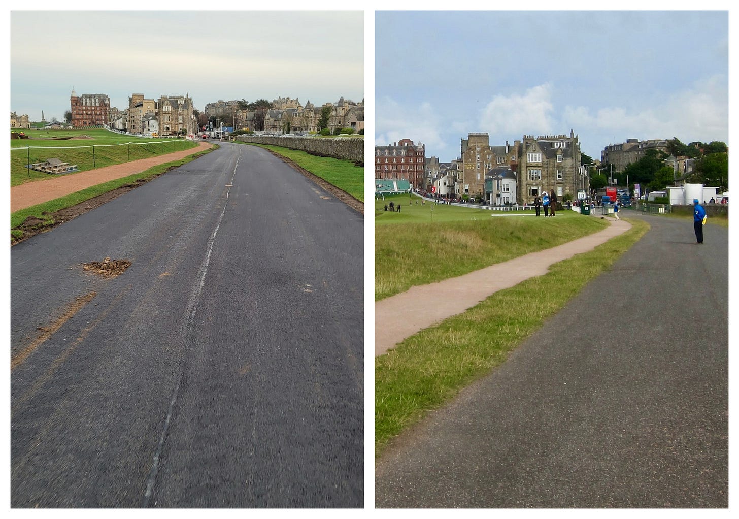 Kieran Harris posted a photo on X of a freshly re-paved road behind the Old Courses’ 17th green. Now, normally road repaving does not fall under The Quad’s jurisdiction, but when this one comes into play on golf’s most infamous par-4, we take a closer look. It certainly looks smoother and more accommodating for pitch-and-run recoveries.