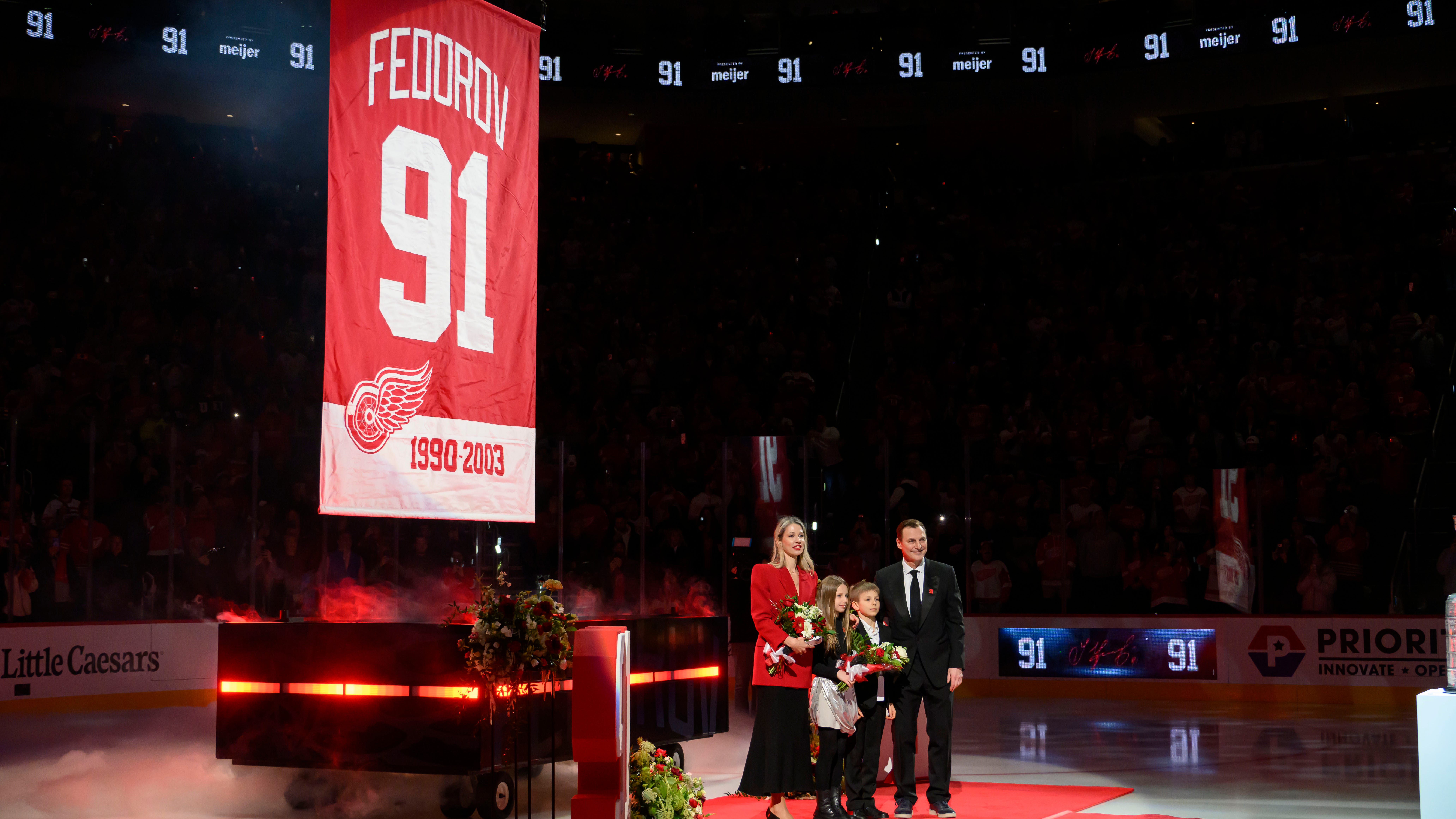 Hall of Famer Sergei Fedorov’s No. 91 raised to the rafters at Little Caesars Arena